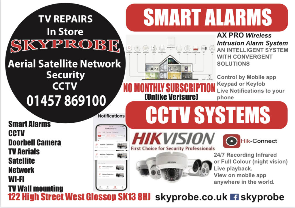 We are the only TV and Security shop in Glossop, also the only TV aerial, satellite, CCTV, and intruder alarm installers plus TV repairers in the Glossop area with a commercial High street presence. This is why Skyprobe continue to be the most trusted choice for sales installations and repairs.